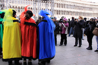 Karnawał w Wenecji przypomina fotosafari. Po Placu Św. Marka i jego okolicach przechadzają się przebrani w kolorowe stroje modele a ludzie biegają za nimi próbując zrobić im zdjęcia (desperaci nawet tabletami, choć iPad zdecydowanie tu sie nie sprawdza). Z daleka zobaczyć można, gdzie znajdujde się ktoś ubrany w ciekawy sposób, wianuszka fotografów dookoła nie sposób nie zauważyć.