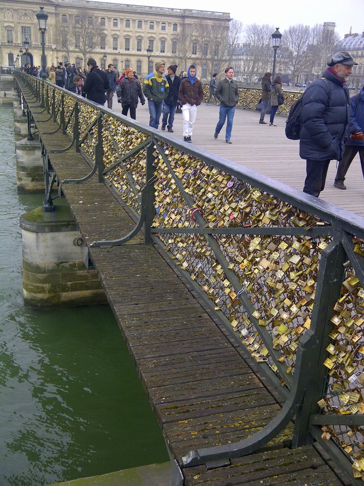 Z niewiadomego powodu władze Paryża nie do końca popierają takie wyrażanie uczuć. Zamiast cieszyć się ze szczęścia mieszkańców i milionów turystów merostwo miasta marudzi coś o zwiększonym obciążeniu mostu i teoretyzuje o możliwości zawalenia się całej konstrukcji. Niby przypadkiem pewnej nocy parę lat temu nieznani sprawcy (na pewno znakomicie zorganizowani zbieracze złomu) odcięli wszystkie kłódki przywracając budowli jej pierwotny wygląd.