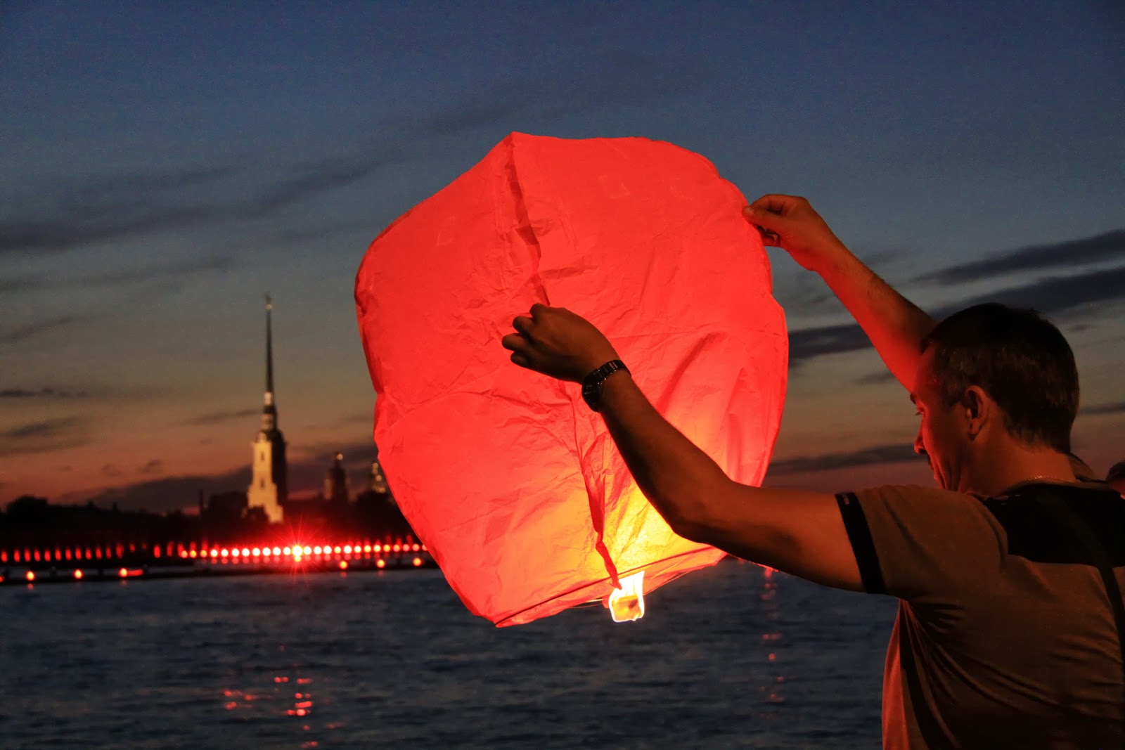 Na ulicach korki, nad brzegiem Newy masa ludzi spaceruje, pije piwo, wielu ku przerażeniu rosyjskiej kontroli ruchu lotniczego puszcza w powietrze lampiony. Na rzece panuje prawdziwy tłok, statki turystyczne odpływają co chwilę od nabrzeża załadowane turystami chcącymi z bliska obejrzeć otwieranie się mostów.