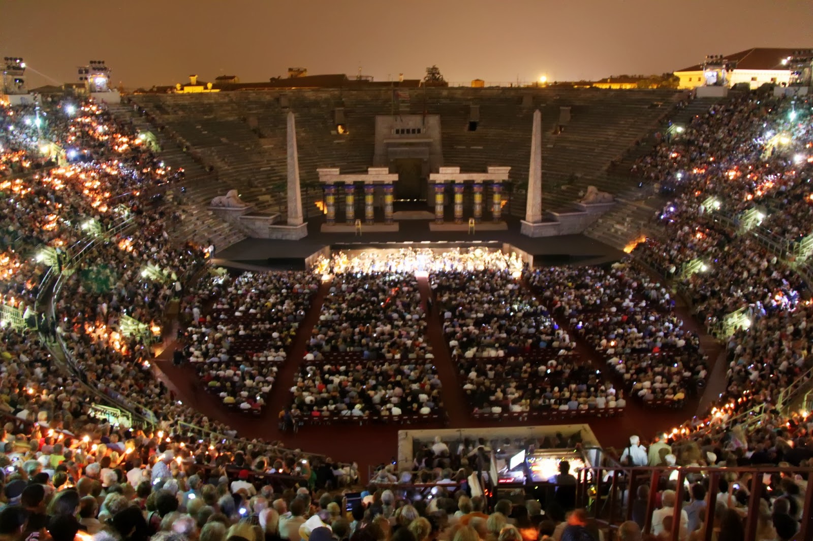 Początki uczucia sa jak zwykle superoptymistyczne. Człowiek cieszy się jak wariat na możliwość obejrzenia Aidy wystawianej w starym ale dobrze zachowanym rzymskim amfiteatrze. Dyryguje Placido Domingo, trudno sobie wyobrazic lepsze warunki do delektowania się operą. Nawet duża kolejka do wejścia i prawie dwugodzinne czekanie na rozpoczęcie spektaklu nie przeszkadzają tak bardzo (lekcja na przyszłość: warto wziac ze soba butelkę wina, zakrzywiającego czasoprzestrzeń, wtedy z parugodzinnego oczekiwania robi się pare minut).
