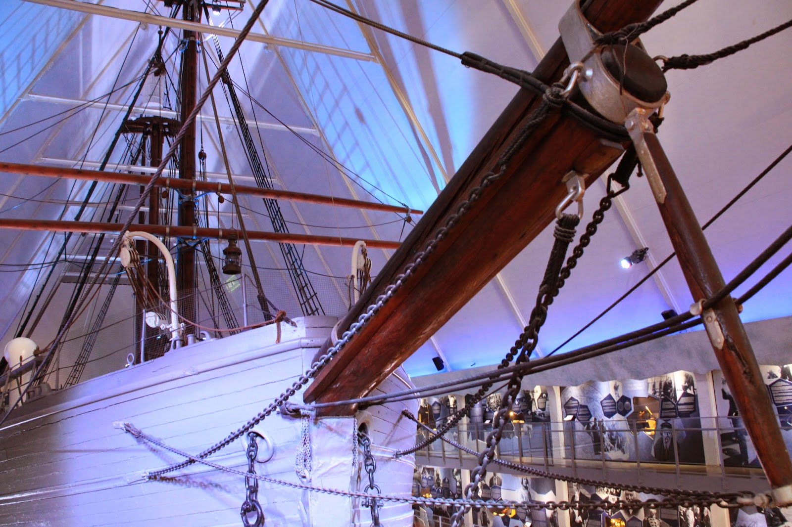Dla kontrastu paręset metrów dalej obejrzeć można bardziej współczesny sposób radzenia sobie z ekstremalnymi warunkami pogodowymi - statek Fram. Zbudowany po to, aby spędzać zimy w okolicach biegunów i dryfować z lodem przez parę miesięcy służył wiernie wielkim polarnikom z Nansenem i Amundsenem na czele. Przetrwał wiele zim polarnych a ukoronowaniem jego kariery było uczestnictwo w ekspedycji, podczas której zdobyto biegun południowy. Po tym przeszedł na zasłużoną emeryturę i już od osiemdziesięciu lat służy jako muzeum.